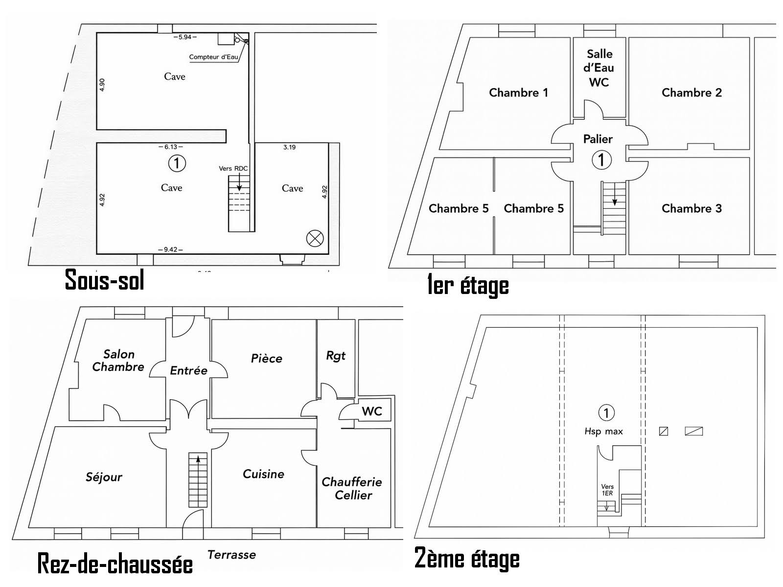 2 appartements aménageables lumineux d’environ 55 m², sols existants conservés, même configuration que le RDC.