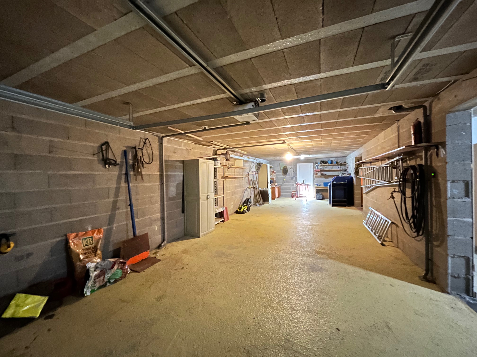 Sous sol complet offrant trois espaces dont un garage deux voitures, une buanderie et une cave ou espace de rangement .